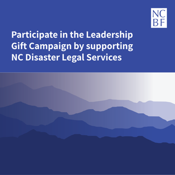 The @North Carolina Bar Foundation Leadership Gift Campaign is a challenge to all volunteer leaders of the @North Carolina Bar Association + NCBF to unite in their philanthropic support of the NCBF and its pro bono and civic education programs. Your gift counts towards participation by making a gift to Disaster Legal Services.